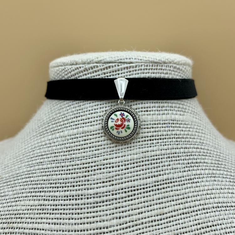 Das Samtband 80% Polyamid und 20% Elasthan. Die Emaille sind aus Kunststoff gefertigt. Der Anhänger bestehen aus Zink-Druckguss.